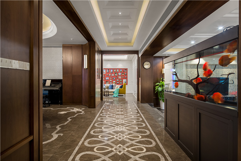 寬敞而狹長的大廳從南至北貫穿整個(gè)房屋,設(shè)計(jì)師在這個(gè)超大空間大膽采用了咖色地磚,升華著整體的環(huán)境的格調(diào)。同樣色系的拼花將它一分為二,一邊是餐廚區(qū),一邊是客廳,這條自然形成的走廊便可直達(dá)偏廳(起居室),所有臥室都集中在這一部分,形成動(dòng)靜分區(qū)的自然過渡。