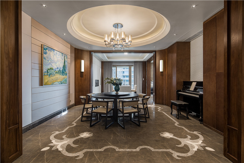 餐廳延續(xù)客廳的設(shè)計(jì),橡木與硬包的結(jié)合,圓型的吊頂與餐桌上下呼應(yīng),家中唯一的一盞大吊燈使餐廳更加敞亮,并賦予了高朋滿座時(shí)的歡愉熱鬧。