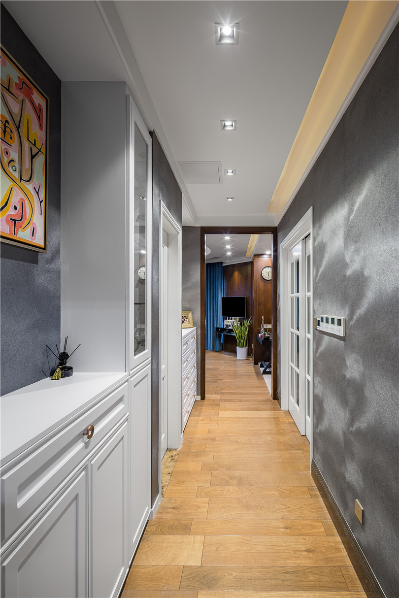 進(jìn)入主套的走廊采用高級(jí)灰帶來更多理性的氣息,配以超現(xiàn)實(shí)主義畫家保羅克利的掛畫,更顯示房主不俗的藝術(shù)修養(yǎng)。