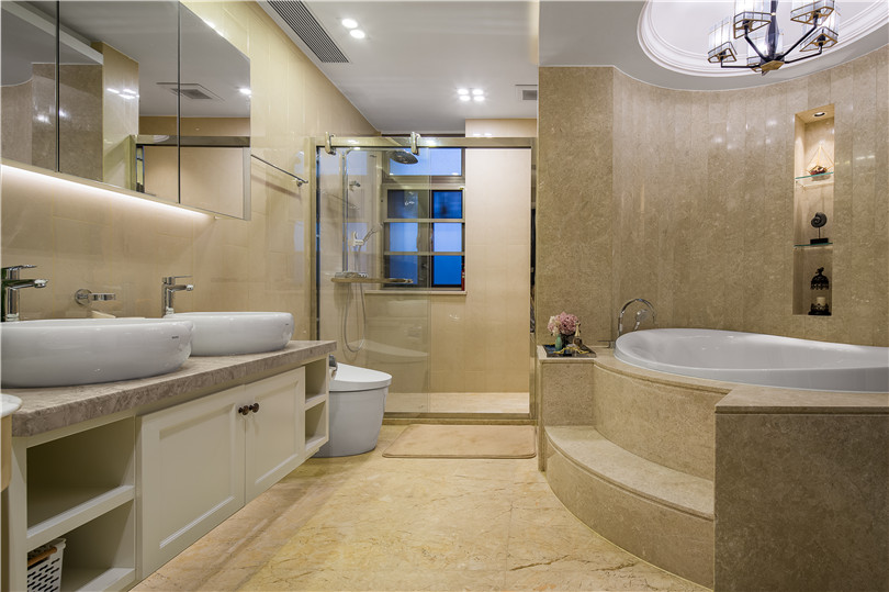 大理石打造出的圓形浴缸區(qū)域是衛(wèi)生間的重頭戲,配以兩個(gè)恰到好處的壁龕,營造出奢華與浪漫的氛圍。