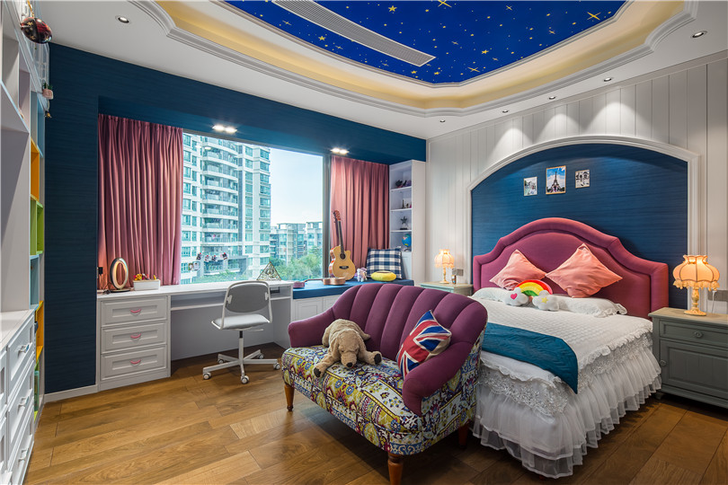 公主房色彩斑瀾構(gòu)成層次豐富而統(tǒng)一的空間想象,整面墻的飄窗一分為二,打造成出一張書桌和一部分飄窗,功能上更為實(shí)用,采光亦是非常好。