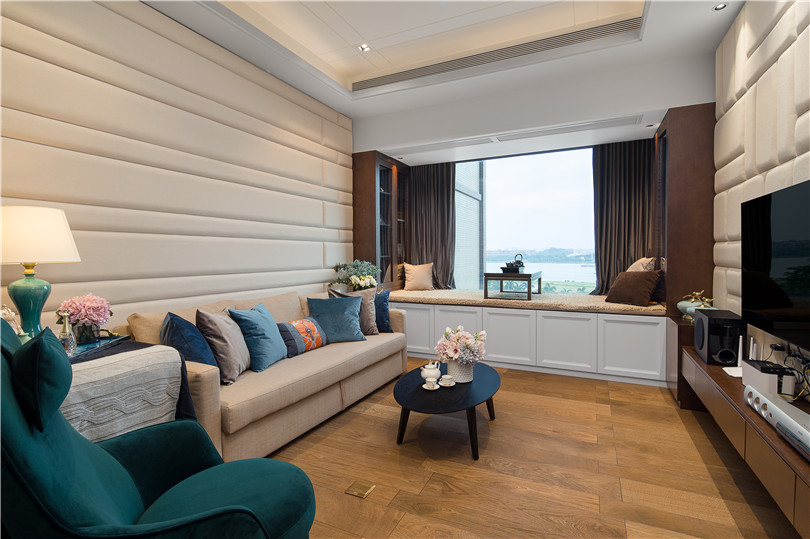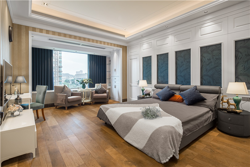 270°落地窗是主臥的亮點(diǎn),搭配藍(lán)色天鵝絨的窗簾,無論白天還是夜晚,這里都時(shí)時(shí)透露著典雅與時(shí)尚。