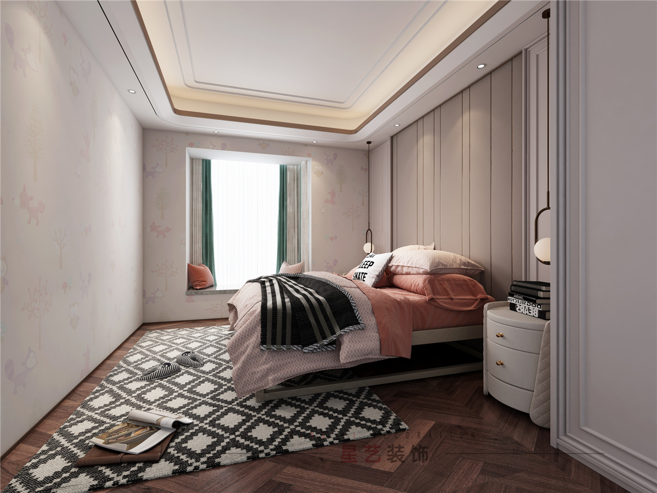 效果圖中的男孩用了大量的黑白灰設計,也是男孩子普遍比較喜歡的簡約設計,稍微有些凌亂的擺放也增添了生活的氣息。女孩房的效果圖中給人感覺非常溫馨舒適,墻上得狐貍圖案也顯得活潑俏皮。