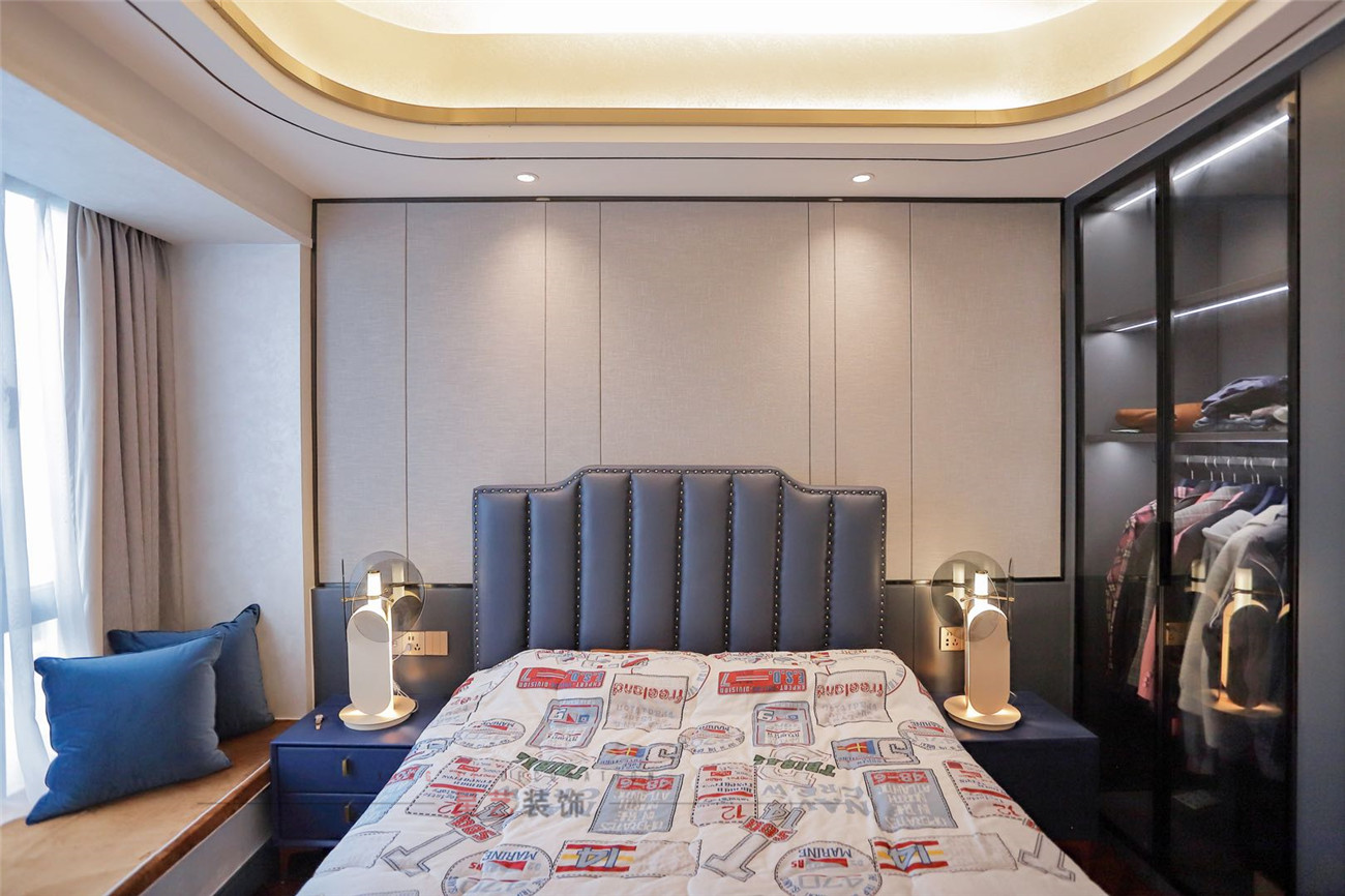 男孩房的實景中則是用了看藍色調做渲染,被子的英文海報圖案和設計干臺燈增加了臥室的潮流感,也有用到對稱的元素,大氣簡約。