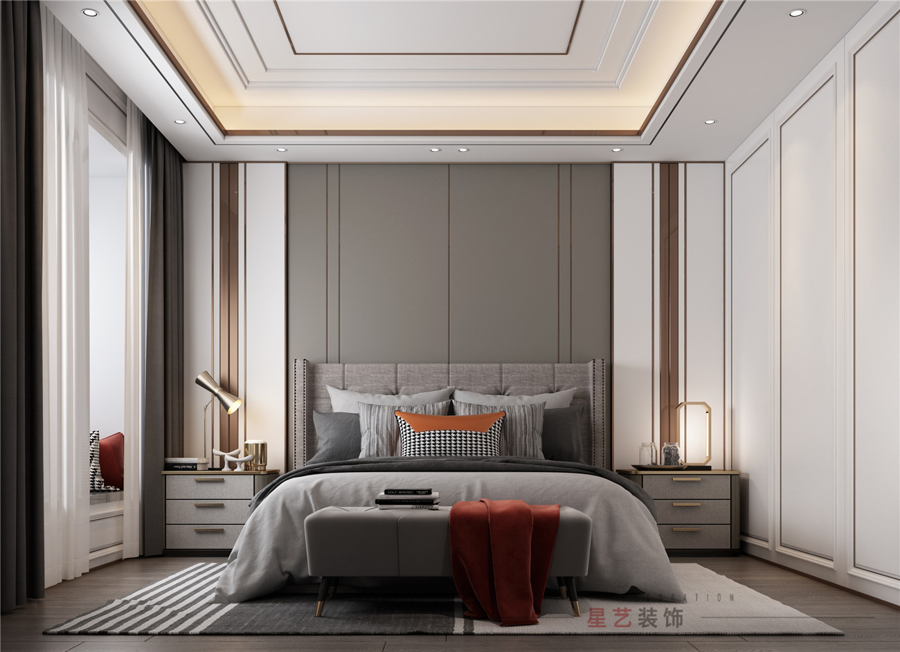 效果圖和實景圖中的主臥都用了大量的對稱元素,墻面,衣柜和天花板都有用到對稱的手法,效果圖整體色調偏向黑白灰,用橘色做點綴,簡約又不平凡。