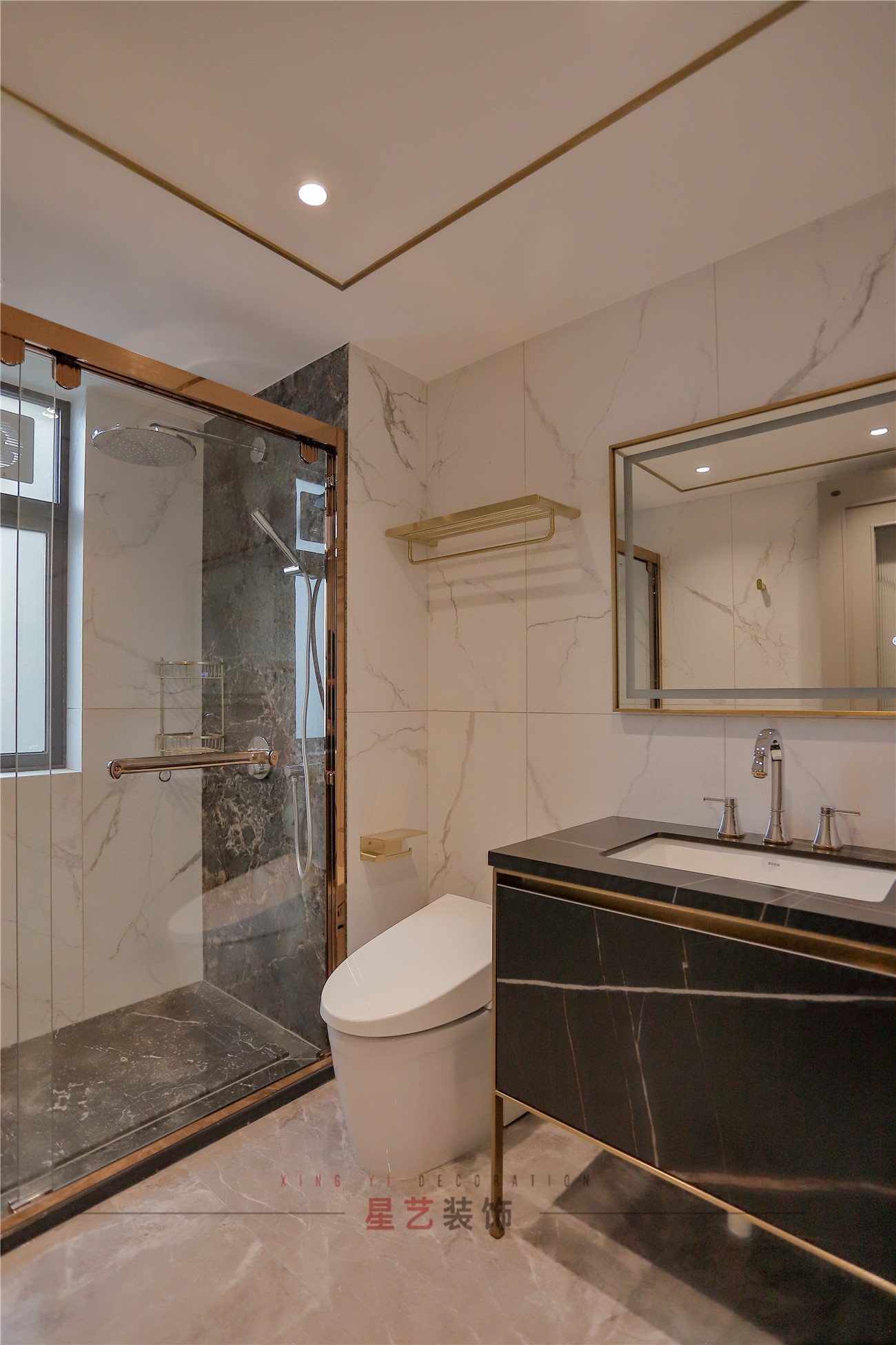 浴室主要采用淋浴的設計,隔間設計做到了干濕分離的效果,金邊設計讓整體風格奢華而又不會太過浮夸,讓每天回家得生活都能在最放松的環境里卸下一天得疲憊。