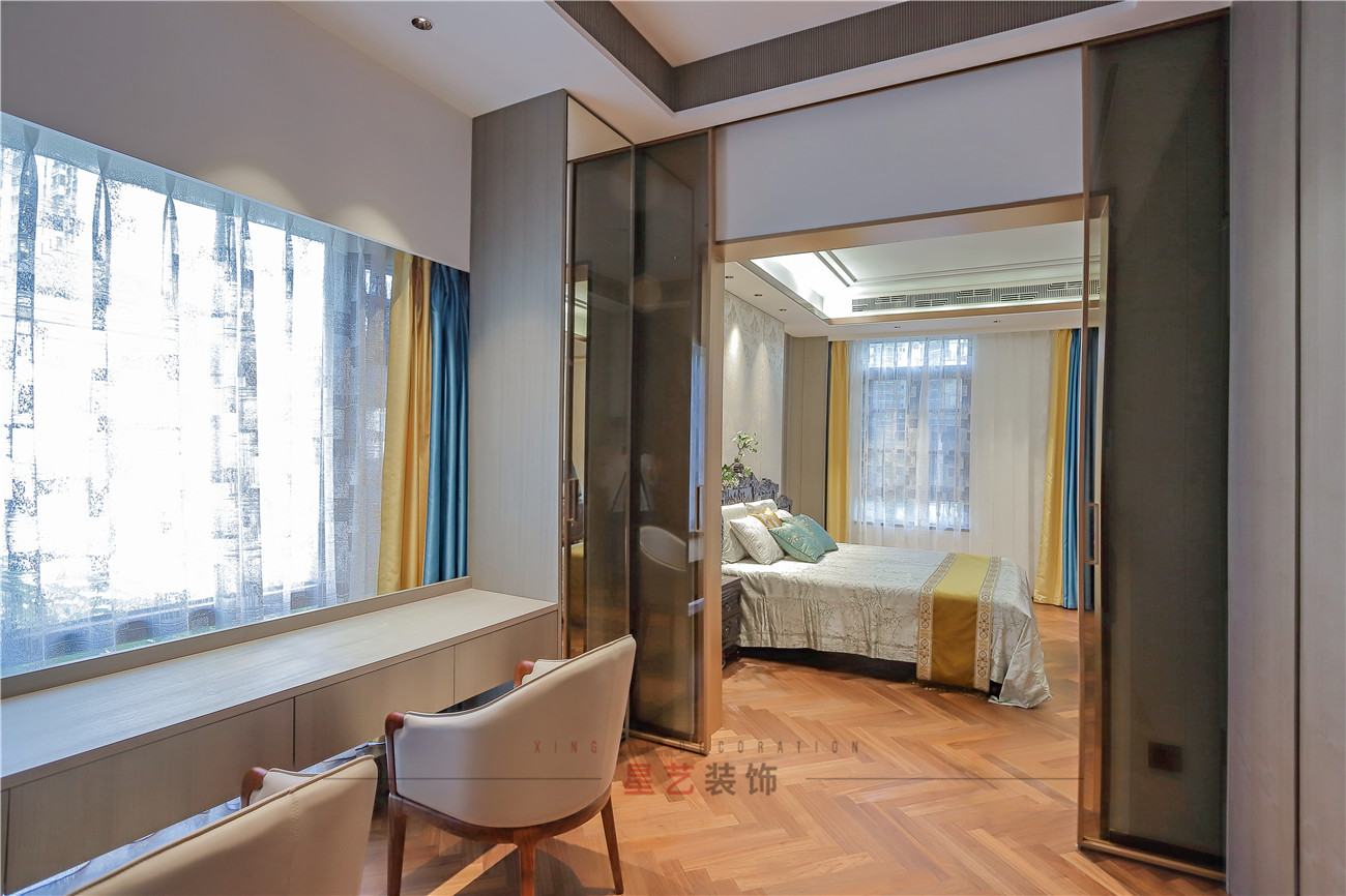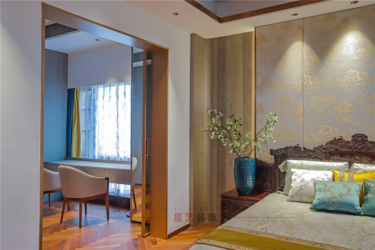 臥室用豐富的色彩搭配營(yíng)造了一個(gè)溫馨舒適的環(huán)境,若隱若現(xiàn)的山水背景墻和枝椏圖案仿佛處在春意盎然的環(huán)境中,感受自然的勃勃生機(jī)。旁邊就可以作為化妝間,屬于愛(ài)美女性的小天地。