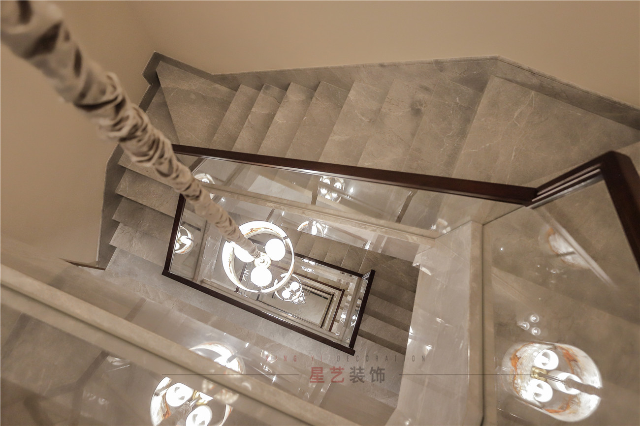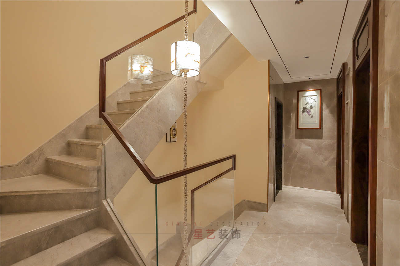 樓梯上巧妙的用了質(zhì)地輕盈,通透的玻璃材質(zhì),富有時(shí)尚氣息,把燈卻做成傳統(tǒng)的燈籠形象,也是設(shè)計(jì)師對(duì)新中式的融會(huì)貫通,強(qiáng)化中式底蘊(yùn)。