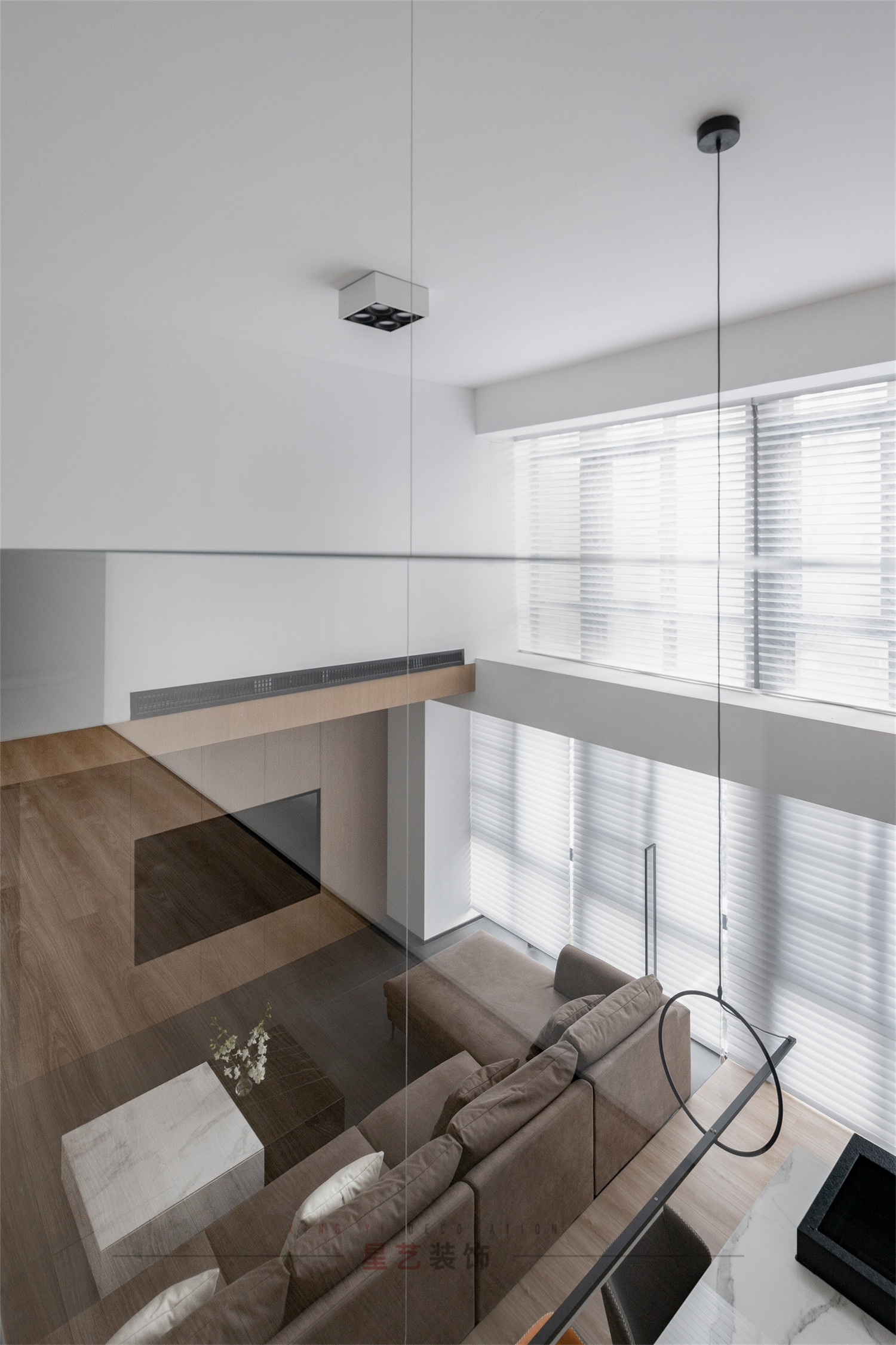 從二樓俯瞰視角就能明顯的發現,客廳的整體的設計非常靈活,根據時間變化的光影效果能營造出各種美輪美奐的夢幻空間。