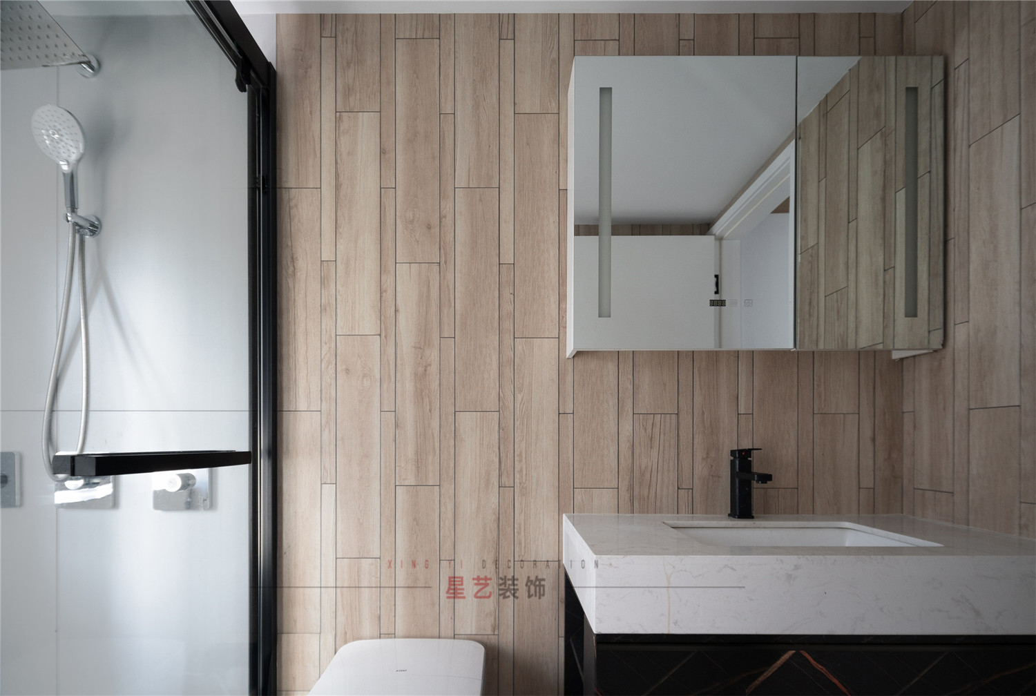 二樓的衛生間采用莊重肅穆的風格,大面積的黑白搭配設計帶來強烈的視覺沖擊,而一樓的衛生間卻自然簡約,好像是走進了清風徐徐得田野上,把人帶回到兒時的記憶。