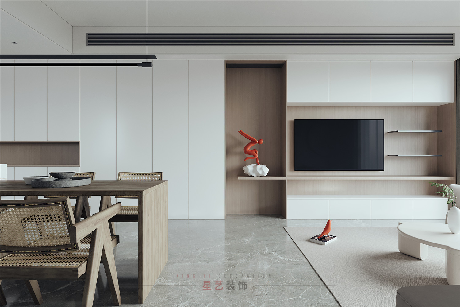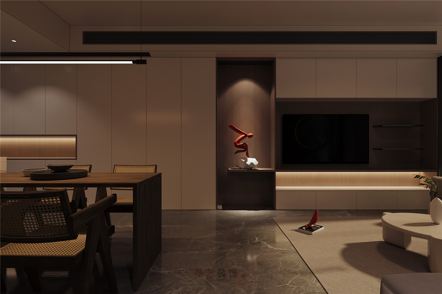 從客廳的角度可以看到極具設計感得端景,用對稱的手法把背景墻一分為二,關燈的時候可能只覺得比較特別,但開燈后,橘紅色的小人在昏暗燈光的映襯下卻營造出了藝術感和視覺美感。