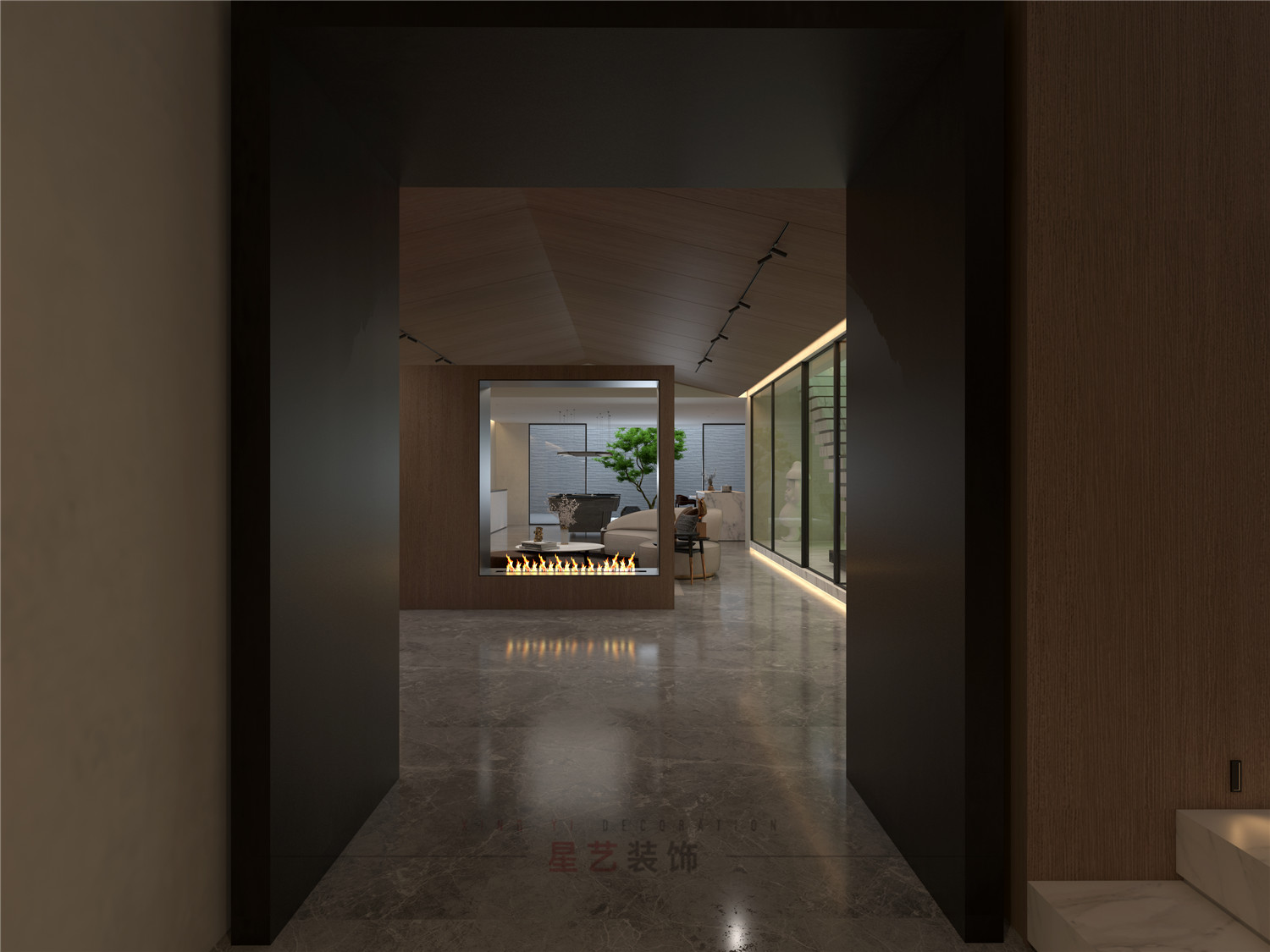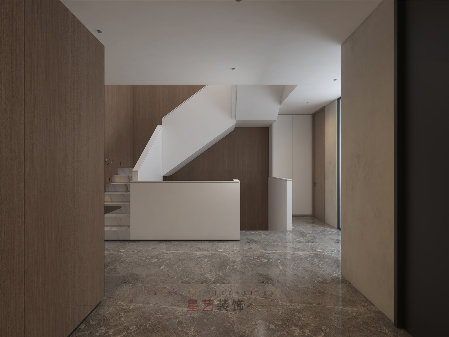 從玄關處用不同深淺的胡桃木配合黑白灰,