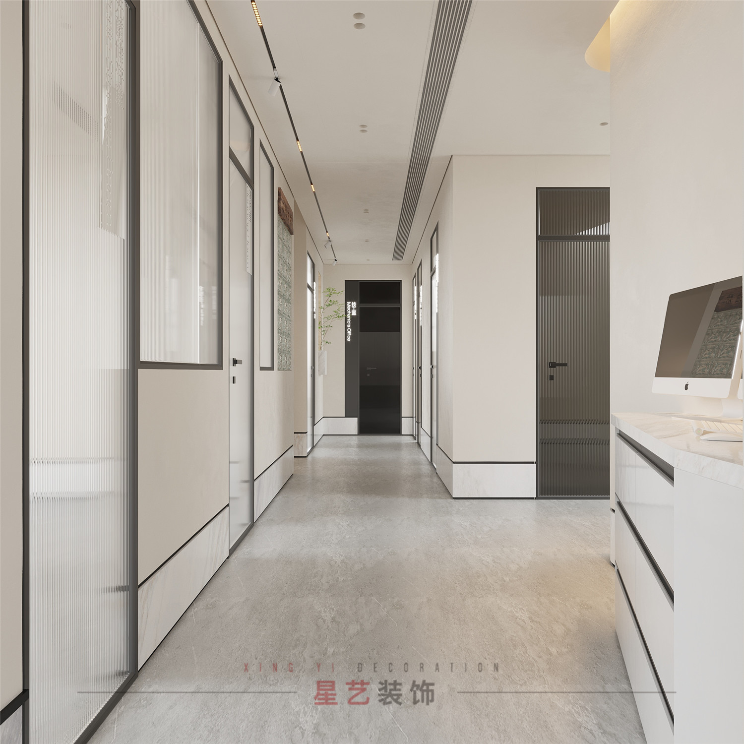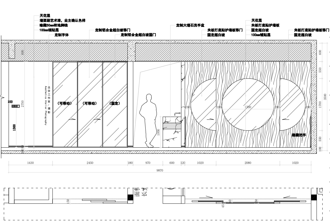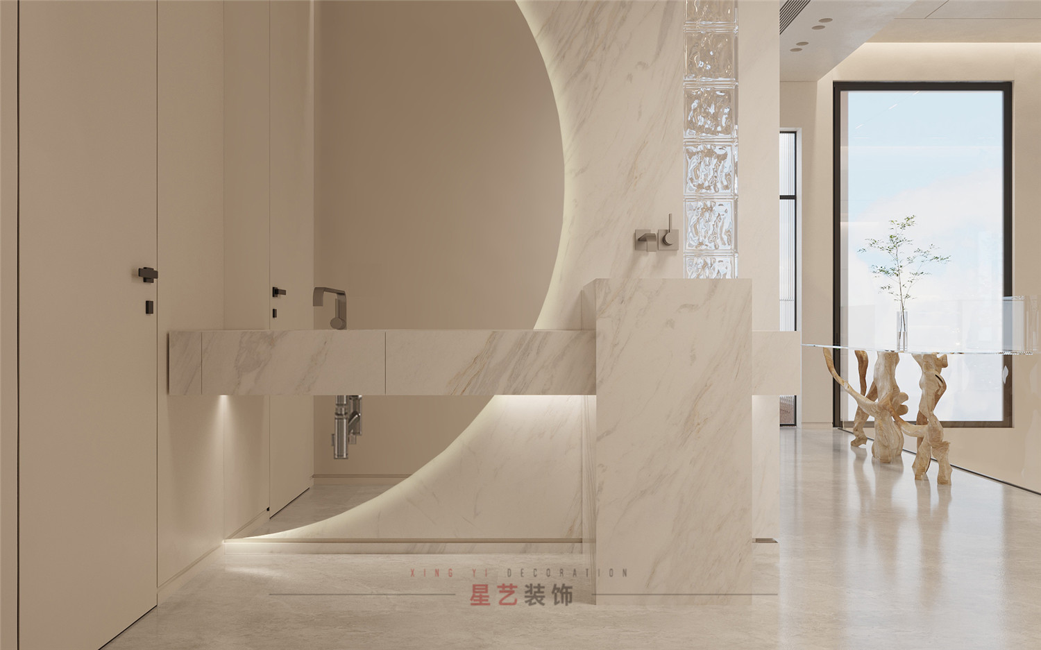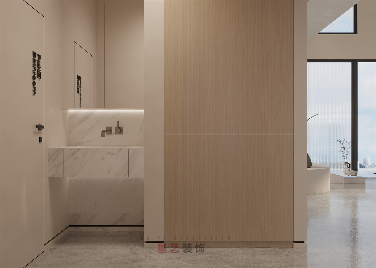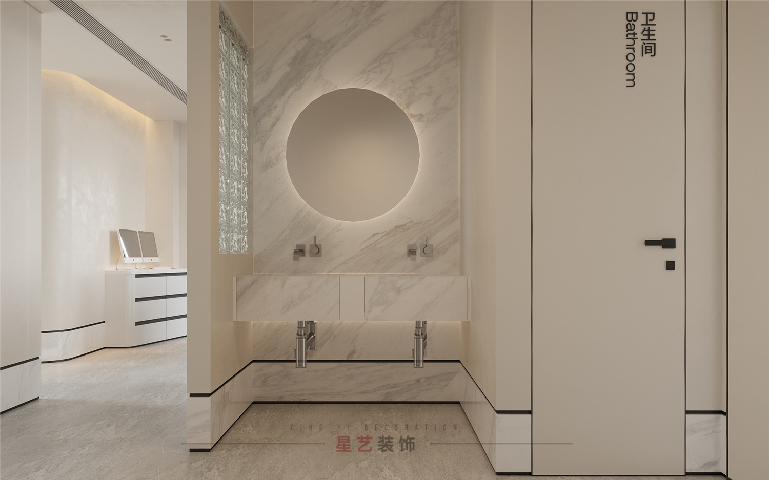 過道處設有衛生間,洗手臺,便捷舒適。墻體與玻璃門都有運用大面積枯山水紋路,詮釋深刻的禪宗美學,從而實現“無水而喻水”的效果,強化細節體現。