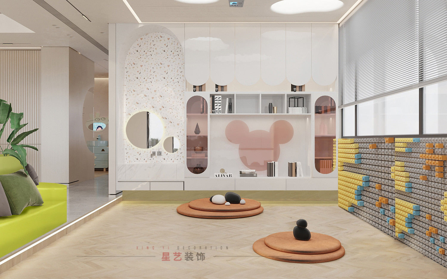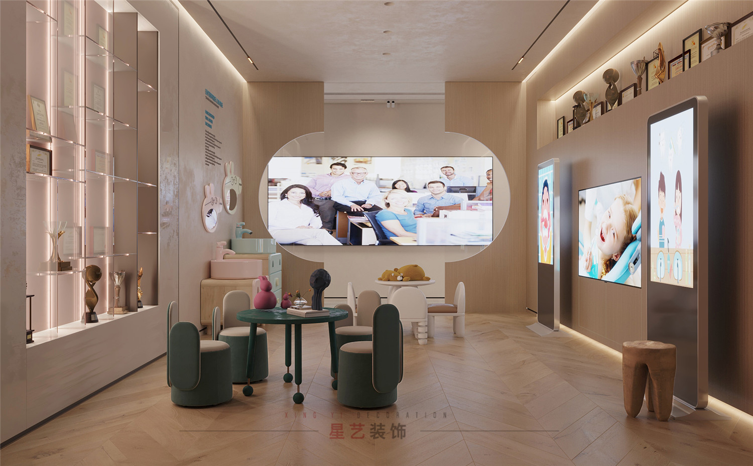 宣教室也能作為等候區,玻璃內嵌展示柜時尚精致,墨綠色桌椅設計感十足,一邊是大人的休閑區,一邊是孩子的玩耍區,功能明確細心。