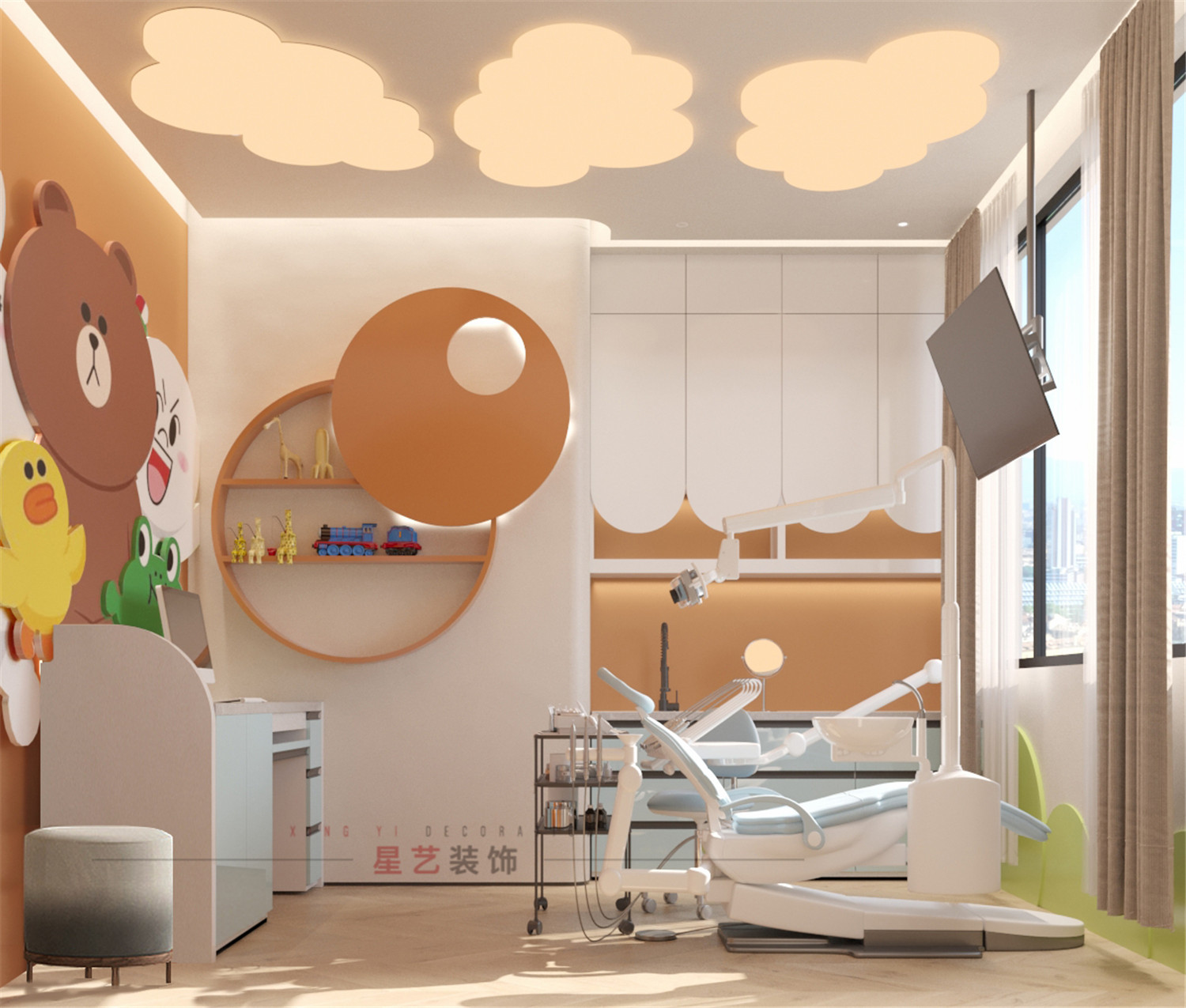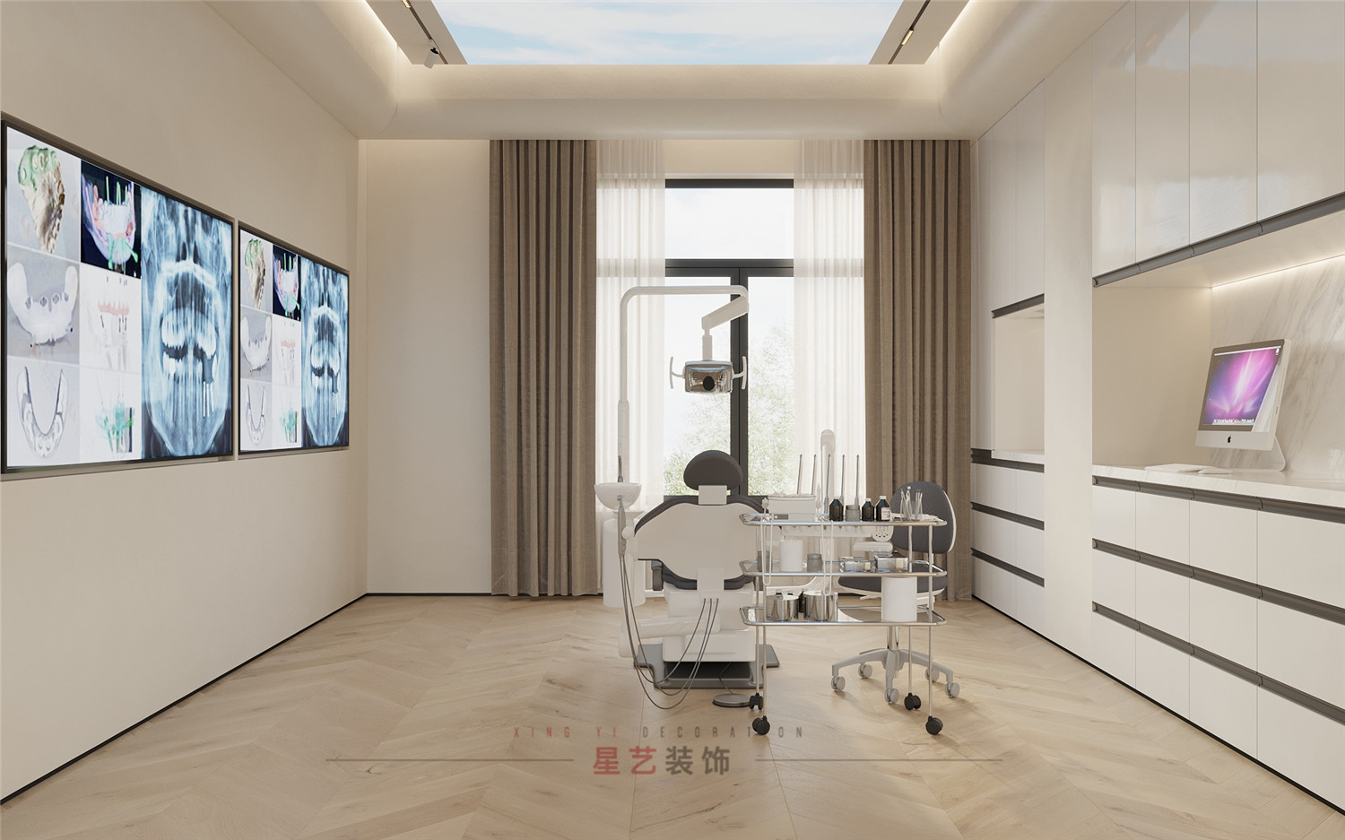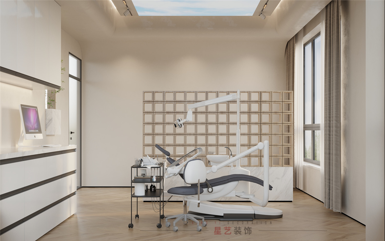 不同功能的診室強調的是實用性與舒適性。牙科ct室用高級灰+白打造靜謐的獨立空間;種植室和正畸室增加了主機和鍵盤位區域,主要設備也都正對窗臺,一縷朝陽落下,整個功能區都呈現出柔和治愈的色彩,忐忑不安的心也慢慢平靜下來。