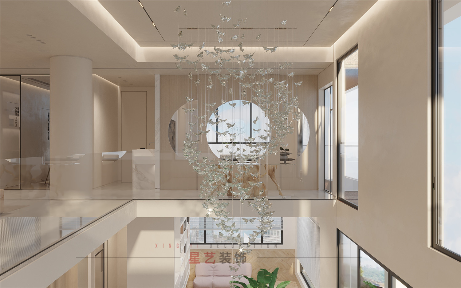 二樓大廳兩根圓柱讓整體空間有了重心, 搭配透明玻璃圍欄互補兼容。水晶吊燈上的蝴蝶栩栩如生,與遠處的圓窗形成絕美的畫面,像是進入愛麗絲仙境般夢幻閃亮。