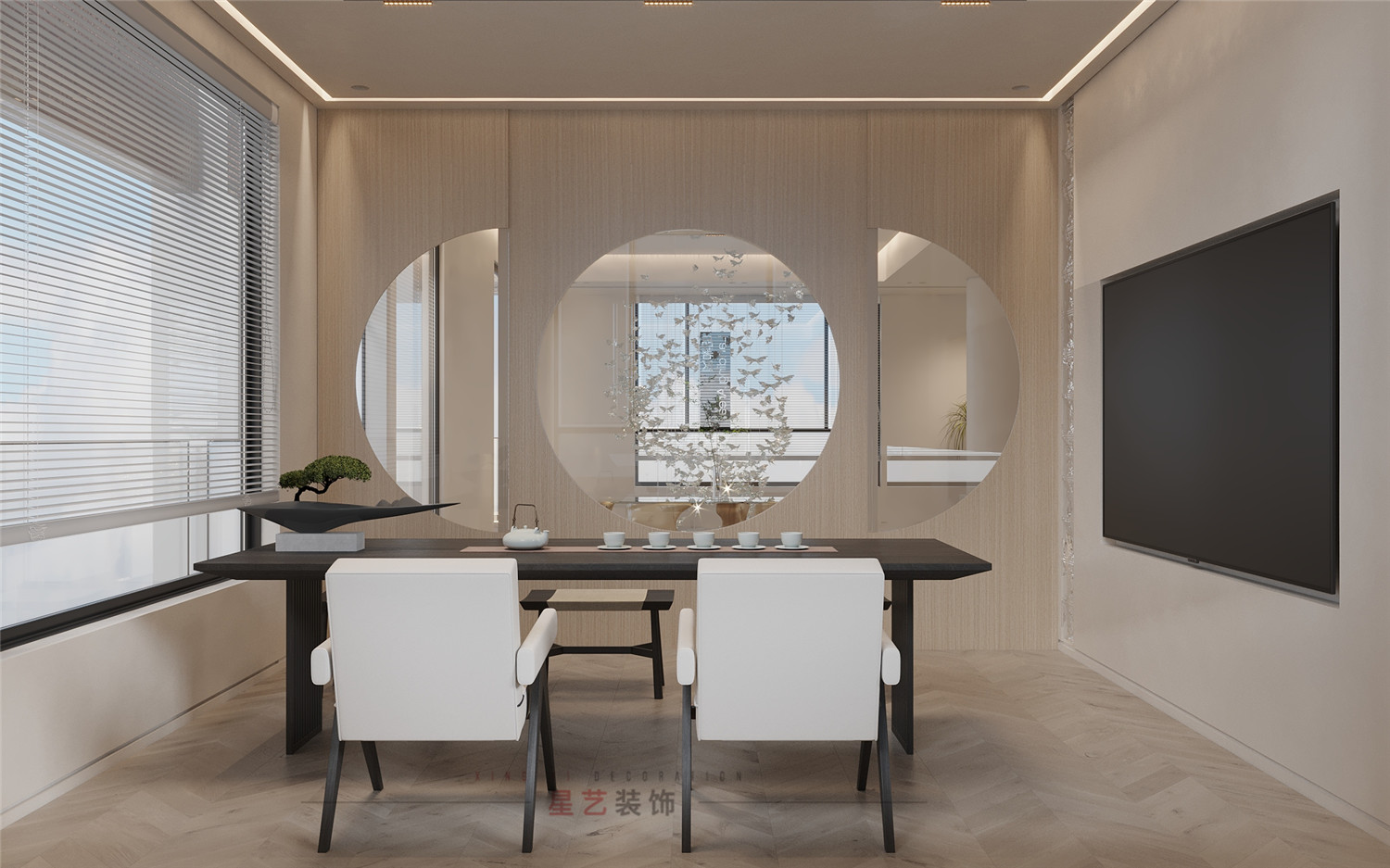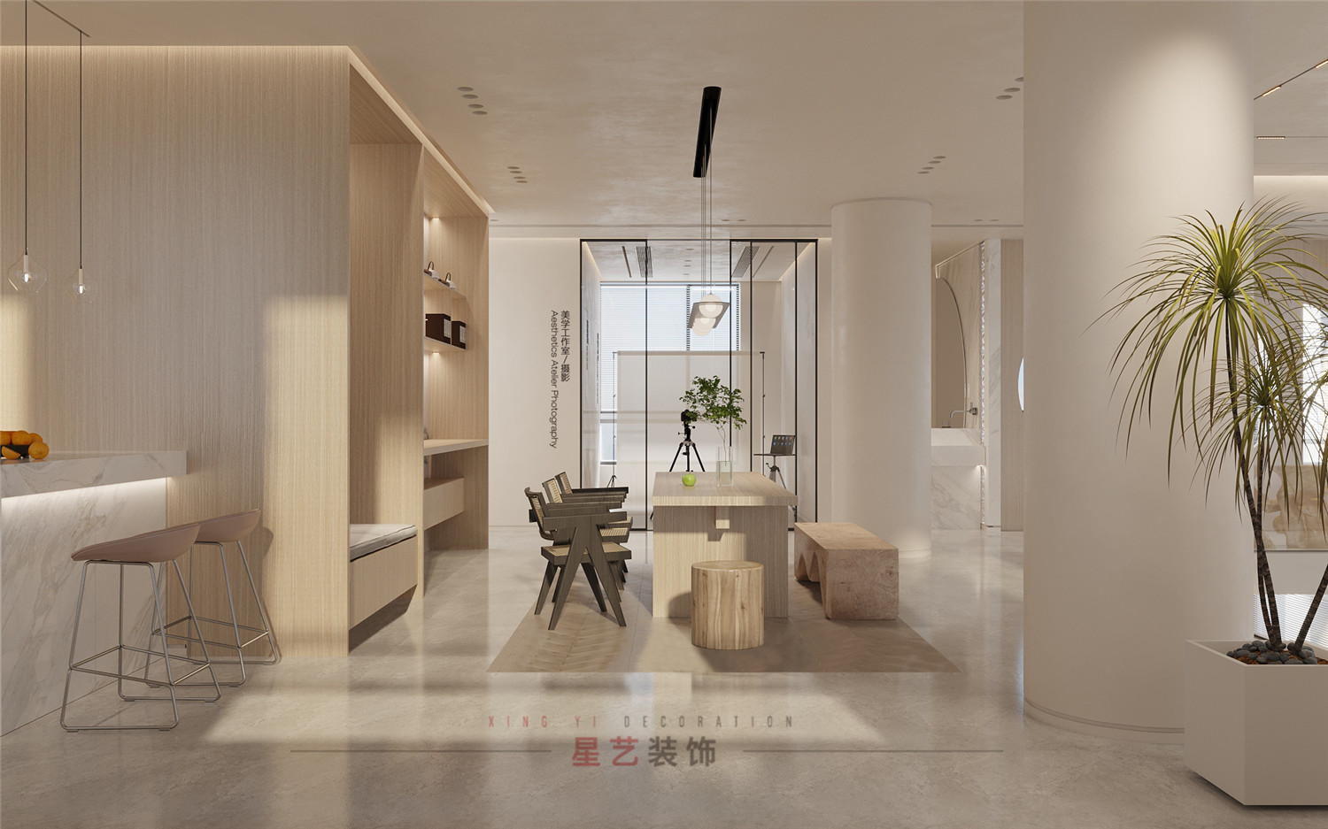 材質及顏色分析:米咖色系,禪意詫寂風、多種木紋材質紋理襯托、大理石原色點綴。