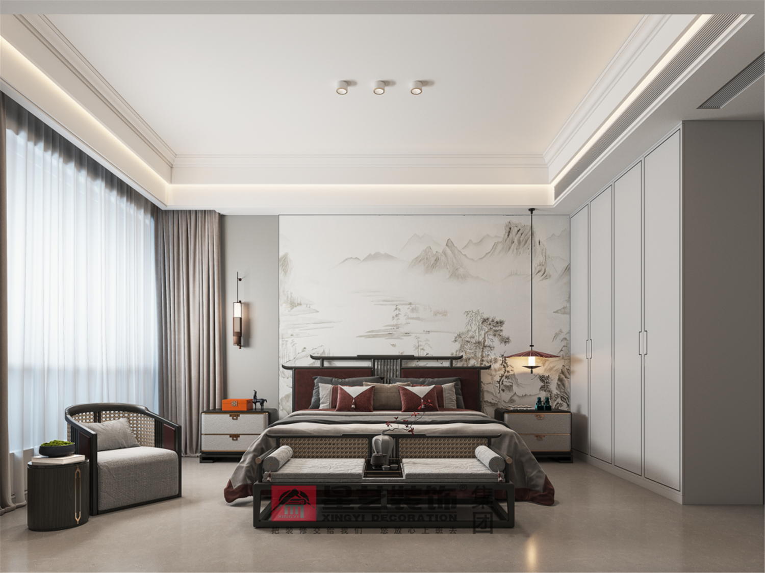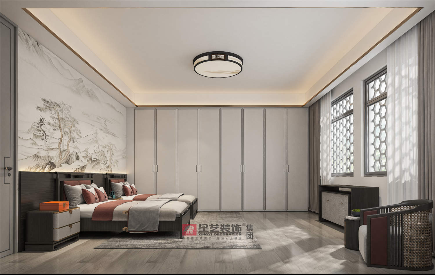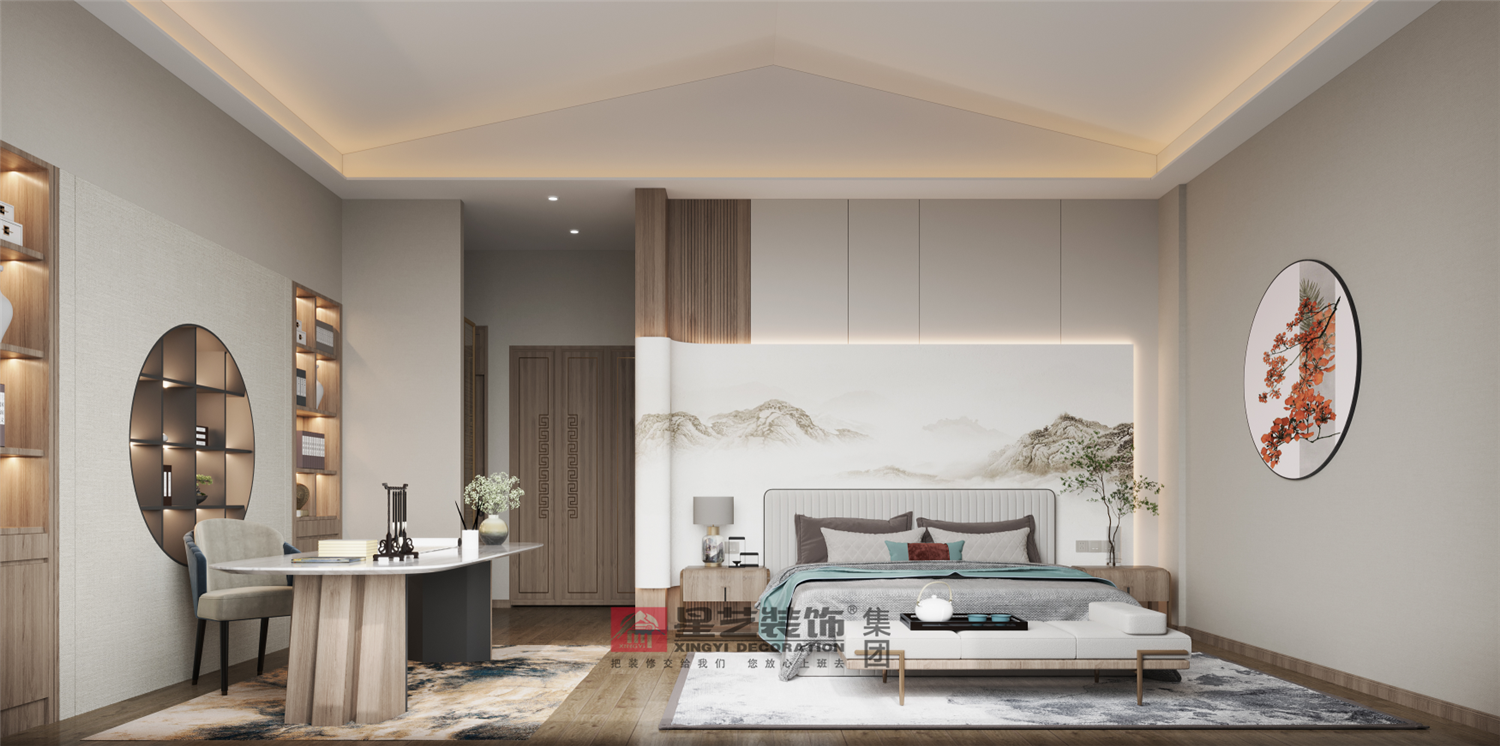 床頭背景書卷如畫,繚繞的遠山在暖光燈的烘托下尤為清幽雅致,寧靜祥和,這個靜是鳥鳴山幽、泉水叮咚甚或如“天籟”的自然之寧靜。