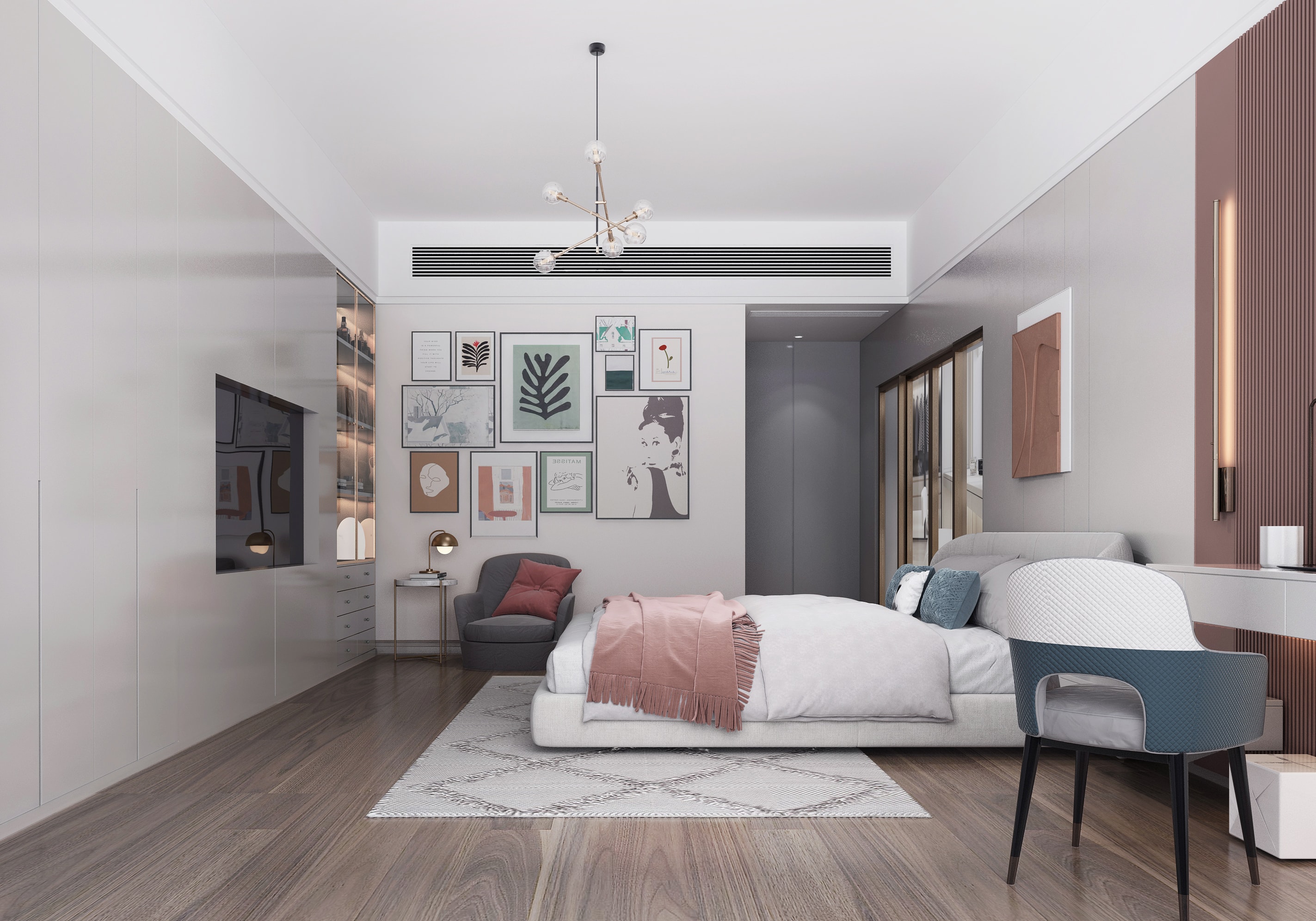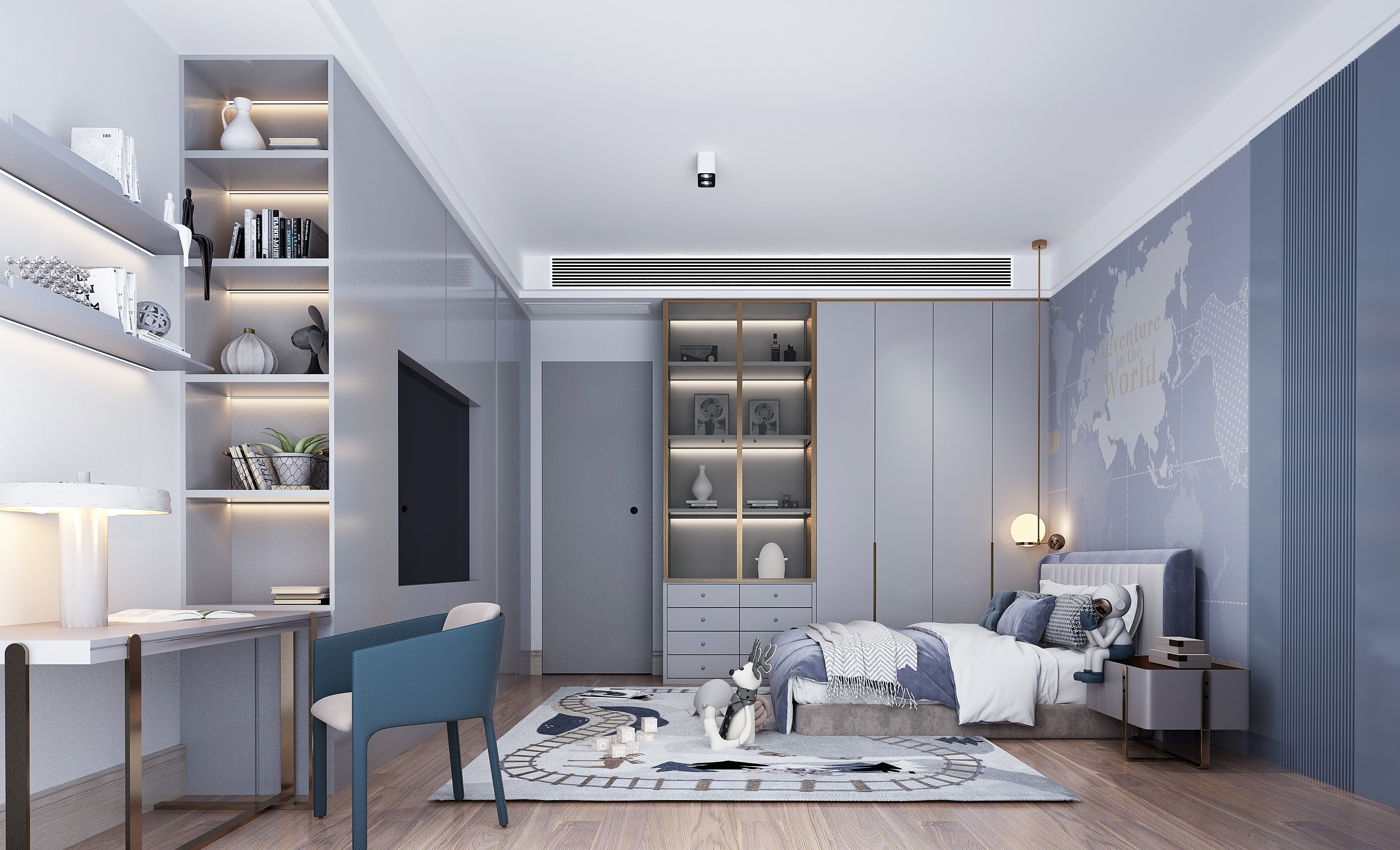 低飽和度的粉色和藍色的兒童房,沒有繁復(fù)的線條和切割造型,只在細(xì)節(jié)處做好陳設(shè),尊重時間、尊重成長。
